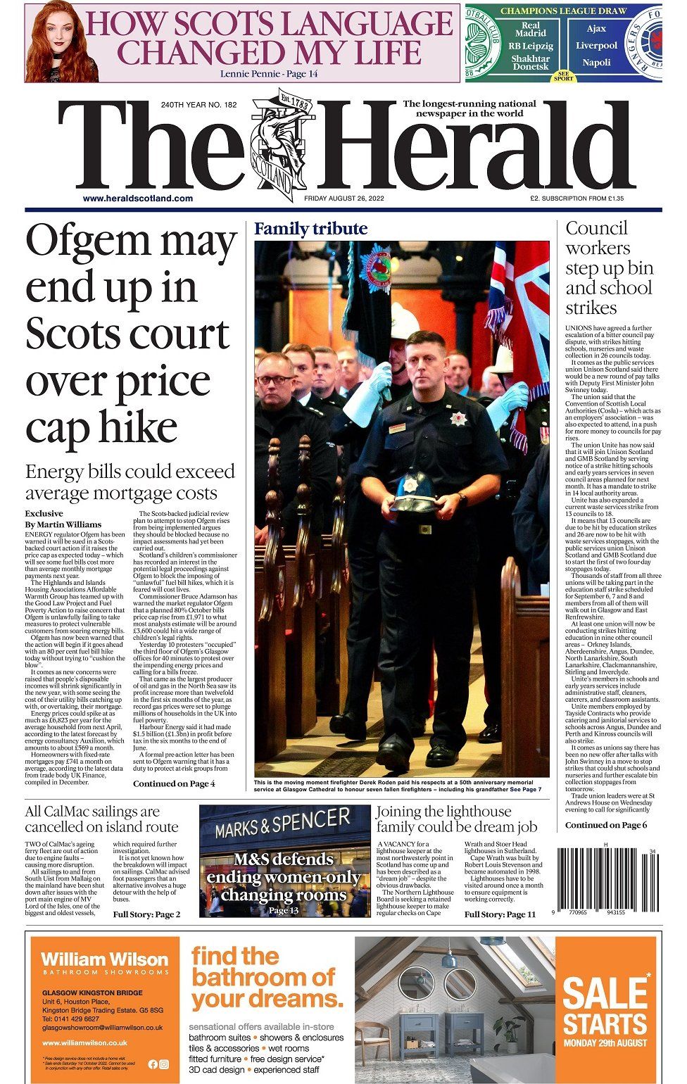The Herald says Ofgem has been warned it will be sued in a Scots-backed court action which could see fuel bills cost more than people's monthly mortgage payments. The paper says the Highlands and Islands Housing Associations Affordable Warmth Group has teamed up with the Good Law Project and Fuel Poverty Action to raise concern that the market regulator Ofgem is unlawfully failing to take measures to protect vulnerable customers from soaring energy bills.