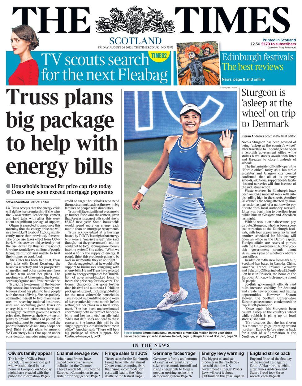 The Times says Liz Truss has accepted that the energy crisis will define her premiership if she becomes the next prime minister. The Tory leadership candidate held talks with the business secretary, her prospective chancellor and other senior members of her team about a "big package" of help, the paper says.