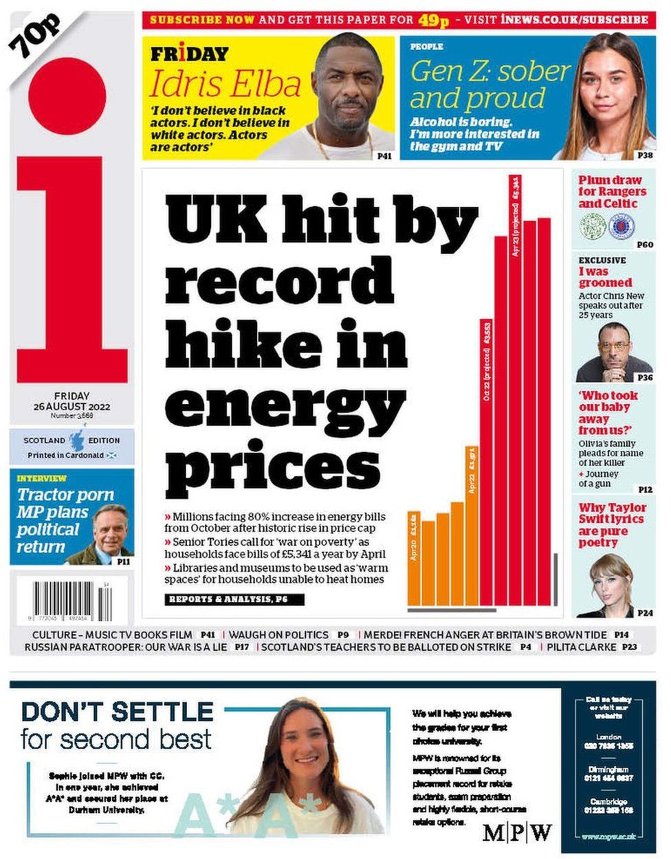 Many of the front pages -out before the energy price cap was announced - lead with speculation that it would rise to more than £3,500. Millions of people are facing an 80% increase in bills from October, declares the i.