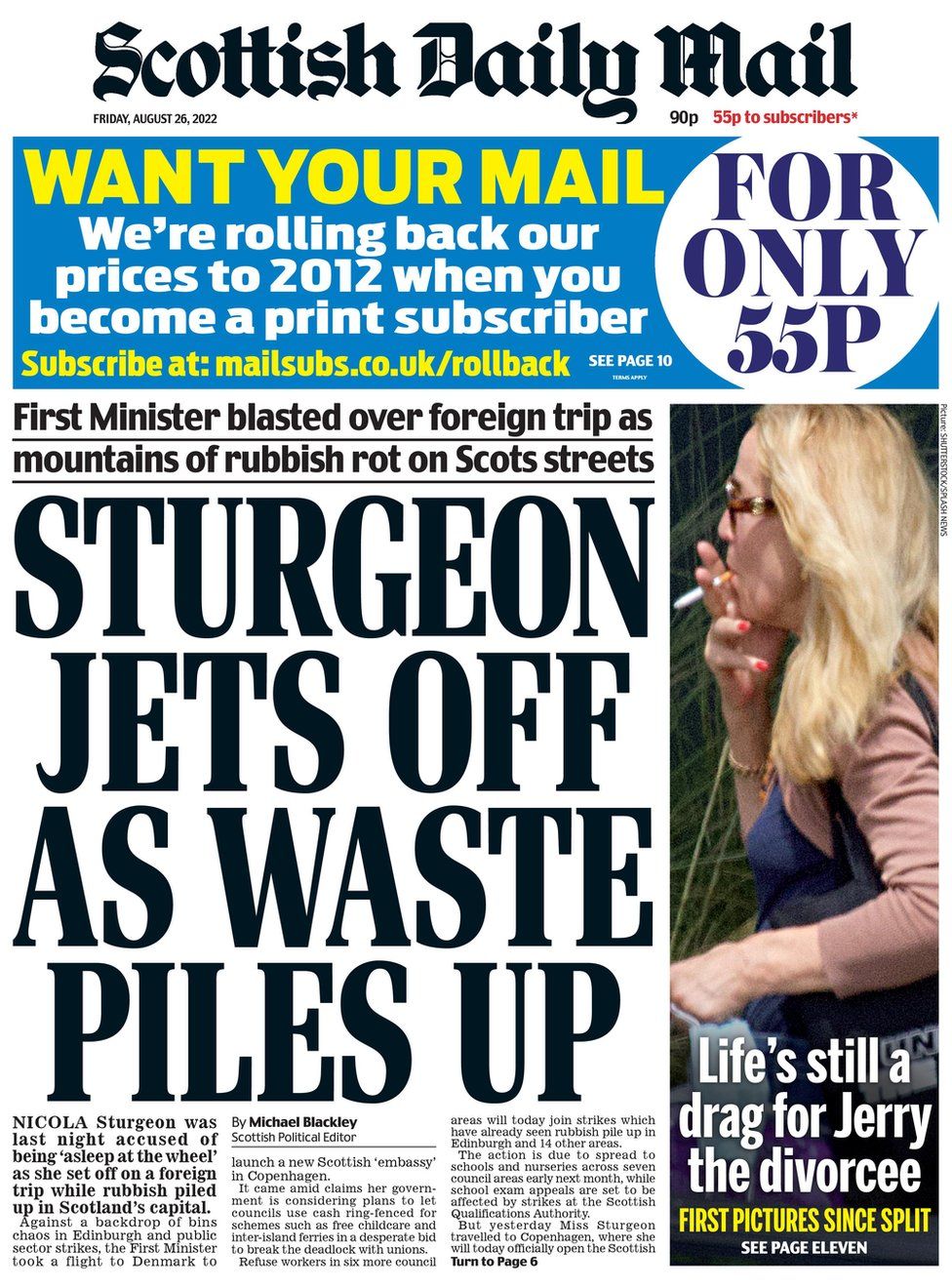 Nicola Sturgeon has been accused by opposition parties of "falling asleep at the wheel" for flying to Denmark during Scotland's strike chaos, according to the Scottish Daily Mail. The paper says she flew to Denmark on Thursday to open a new "Nordic office". The Scottish government building will cost taxpayers an estimated £600,000 a year in upkeep for its day-to-day running and hospitality costs.