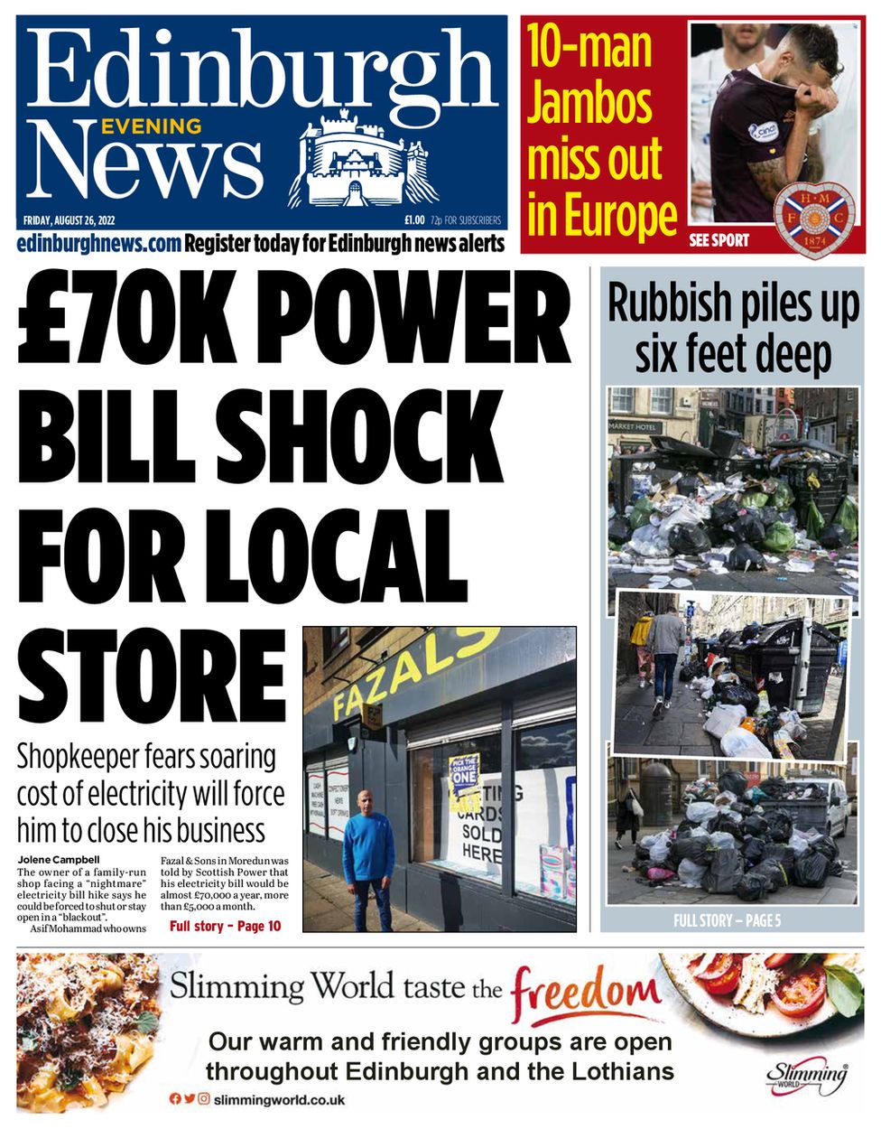 The Edinburgh Evening News reports that the owner of a family-run shop is facing a "nightmare" electricity bill hike and says he could be forced to shut or stay open in a "blackout". Asif Mohammad who owns Fazal and Sons convenience store in Moredun, was told by Scottish Power that the cost of his electricity would be almost £70,000 under a one-year contract - a monthly cost of £5000.