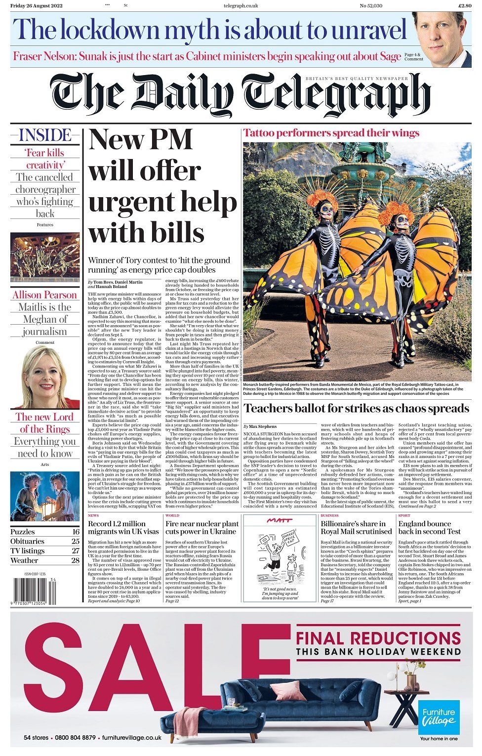 With the price cap rising, The Daily Telegraph says the new prime minister will announce plans to help people with their energy bills within days of being in No 10. A Treasury source has said the chancellor has been working so the incoming PM "can hit the ground running", according to the paper.