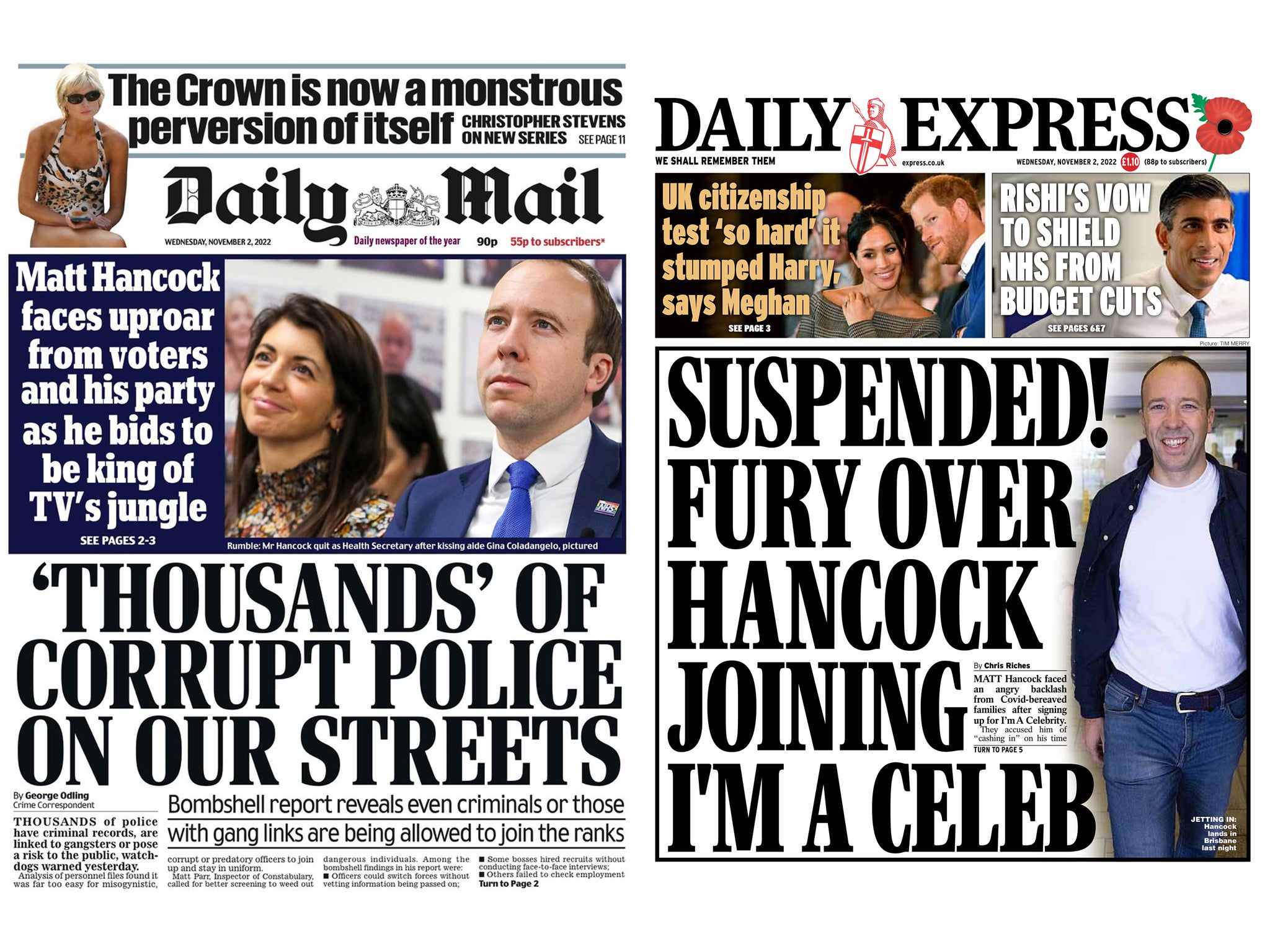Daily Mirror highlights the anger of the Tories and voters, while Daily Express points to Mr Hancock’s suspension from the parliamentary Conservative party.