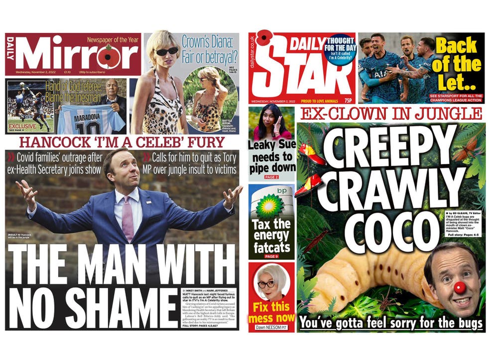 Daily Mirror taking the strongest line against the former health secretary, focusing on calls for him to resign as an MP and the anger of Covid-19 bereaved families, who have accused him of “cashing in” on tragedy. Daily Star throws back to the pandemic era, when for the paper’s readers Mr Hancock was Coco to then-prime minister Boris Johnson’s Bozo the Clown.