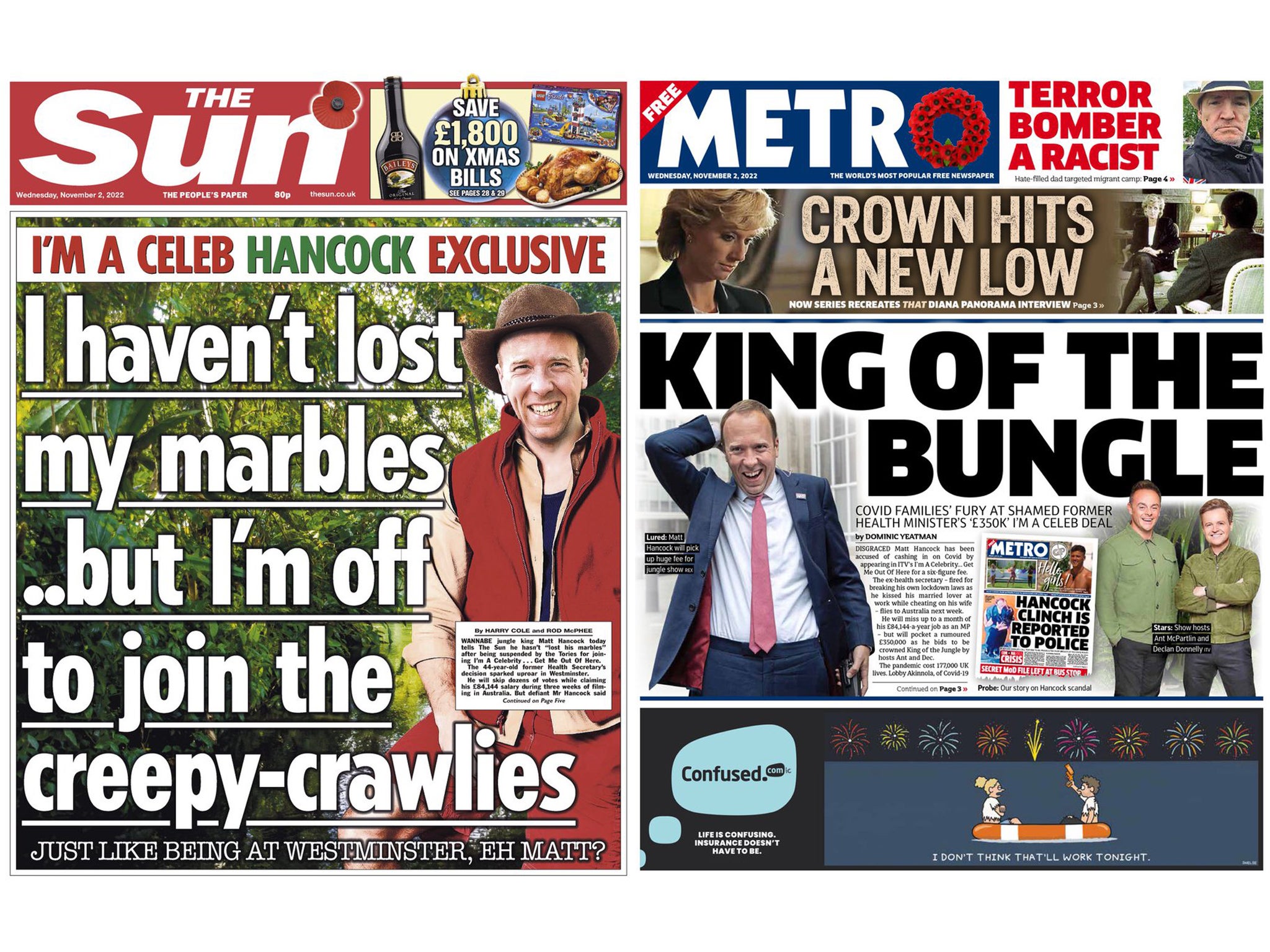 The Sun, which broke the news of Mr Hancock’s jungle jaunt, carries an exclusive article by the MP explaining his reasons for taking the controversial gig. Metro goes with the Covid-19 families and remind readers of the scandal that led to Mr Hancock’s resignation as health secretary.