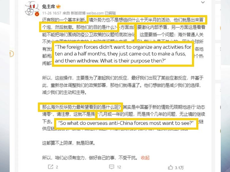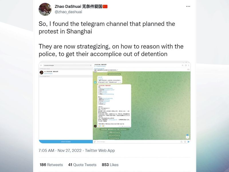 Benjamin Strick, investigations director of Centre for Information Resilience, has identified more than 3,000 posts on Twitter that include hashtags for some of the cities in China where protests are taking place.