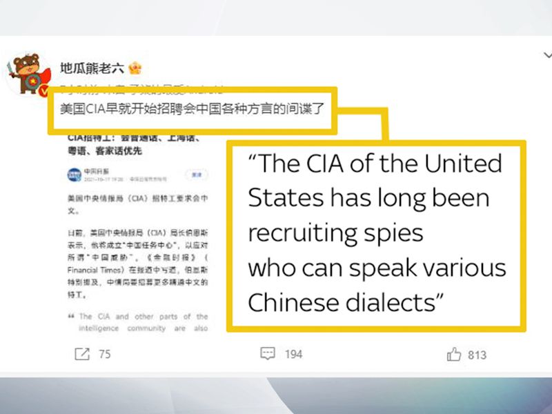 In particular, a screenshot of a news article reporting that the CIA is looking to hire more Chinese speakers is being widely shared.